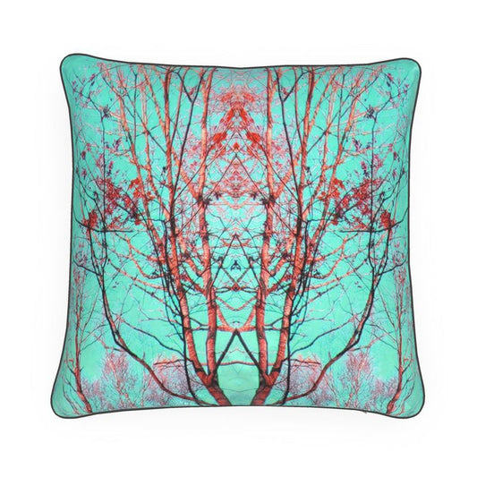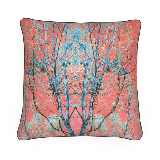 Designer tree inspired cushion. Pinks, blues. Soft and velvety.