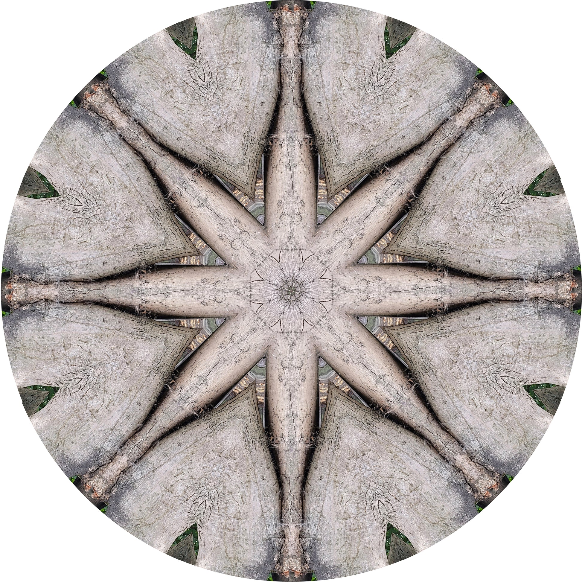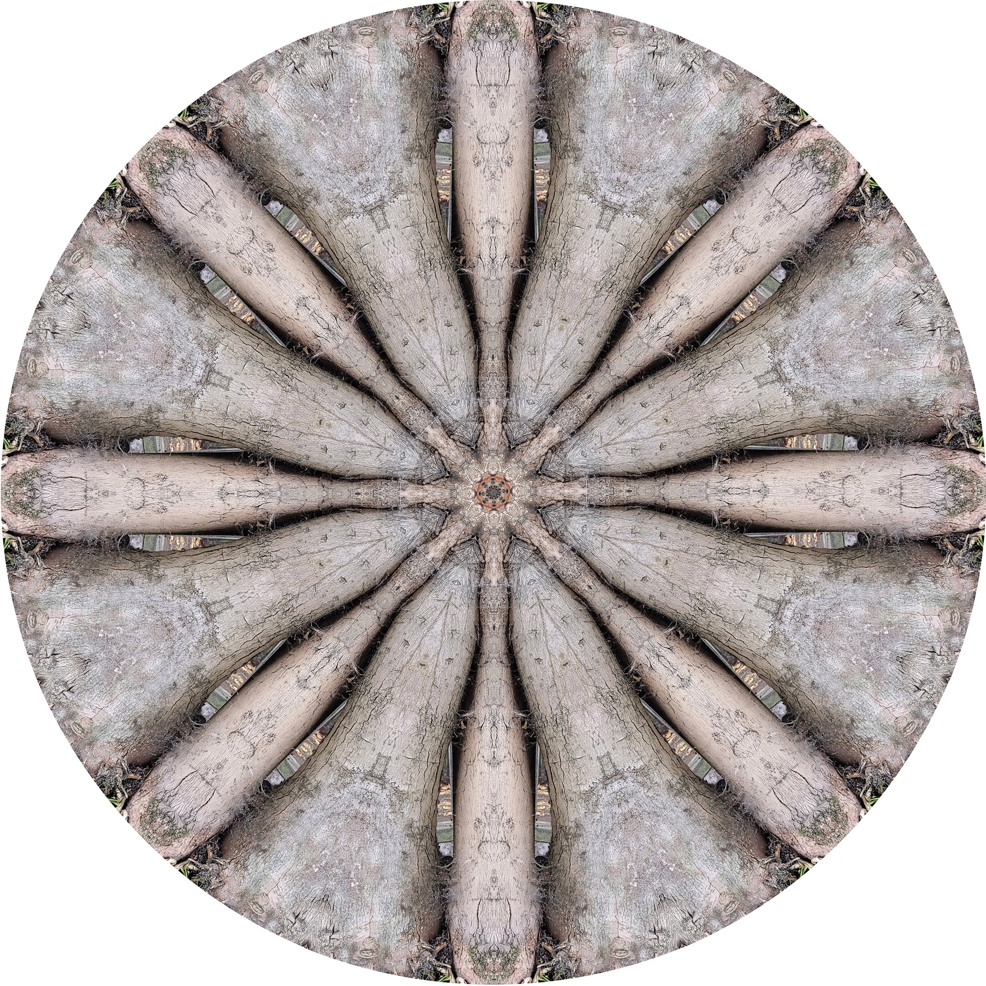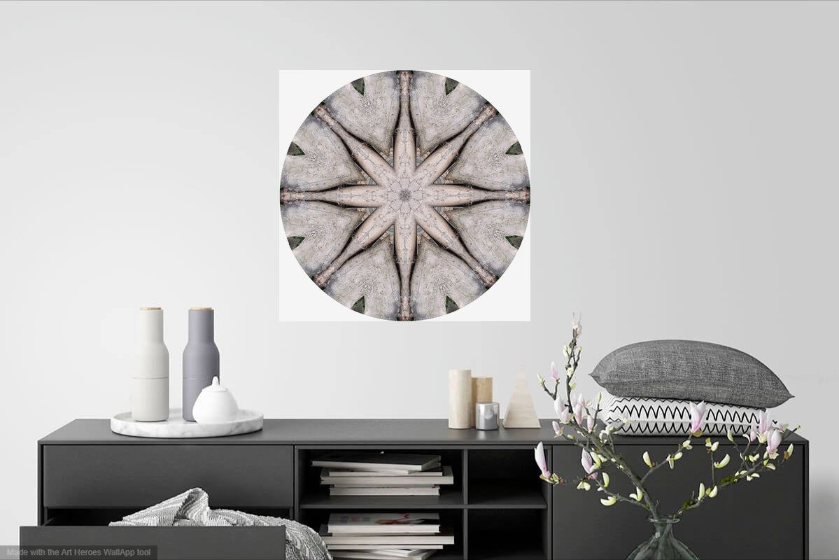 Créé à partir d'une photographie d'un tronc d'arbre contre un mur dans le verger de Solley à Canterbury, Kent, Royaume-Uni. Solley's Orchard est l'endroit où les moines cultivaient les fruits utilisés pour fabriquer du cidre pour le personnel de la cathédrale de Canterbury, il y a des centaines d'années. Je suis frappé par les marquages sur le coffre qui ressemblent à de l'architecture et me rappellent le plafond d'un palais indien. J'ai seulement disposé les parties coupées de la photographie sous cette forme de mandala, les marques sont exactement telles qu'elles sont sur l'arbre, coupées, répétées et collées.