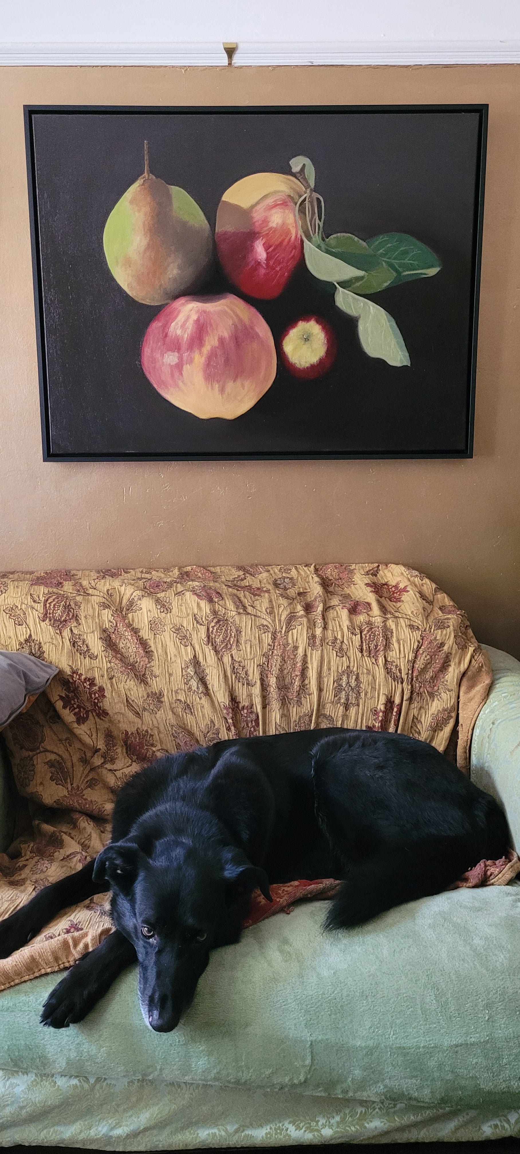 Questo è un dipinto su scala più grande con uno sfondo scuro drammatico. Fornirà una presenza calmante e imponente in qualsiasi spazio.