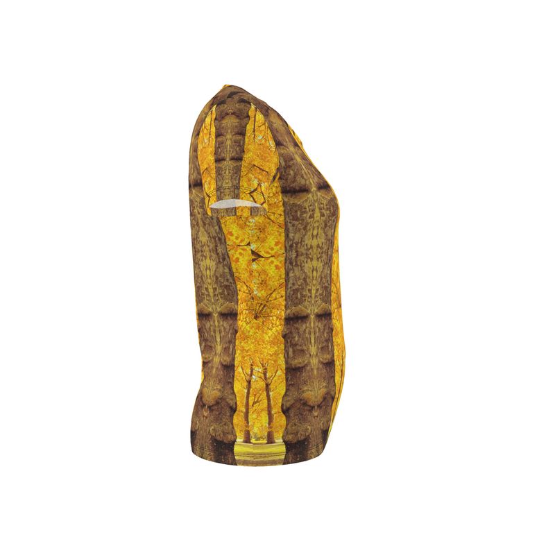 La natura influenza tutti gli aspetti della nostra vita. Qui abbiamo colonne di alberi che sembrano architetture. Questa maglietta unisex da donna giallo oro è una dichiarazione di moda unica progettata da un artista. Questo intrigante design è stato creato utilizzando una fotografia di alberi scattata a Green Park, Londra, vicino a Buckingham Palace. Indossa l'arte, indossa la natura, sentiti bene.