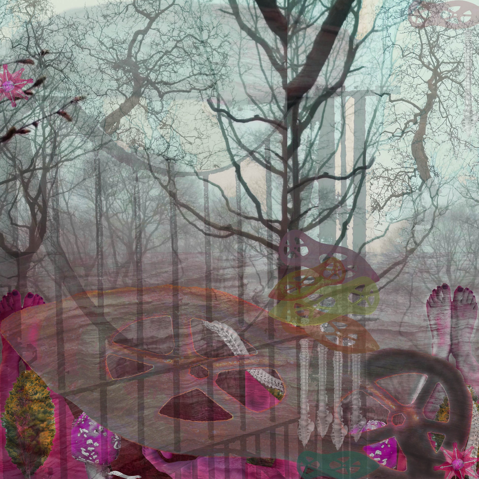 Questi collage sono compilati da fotografie manipolate che ho scattato con il mio telefono e mostrano le cose a cui non posso accedere facilmente e per le quali devo combattere attraverso strati di bisogno e nuove priorità. Preferiscono spine, gambe e farmaci, simboleggiati da funghi velenosi con alberi di tasso che rappresentano la mortalità; tutto vela e limita, con un certo grado di umorismo, la natura con cui desidero disperatamente connettermi.
