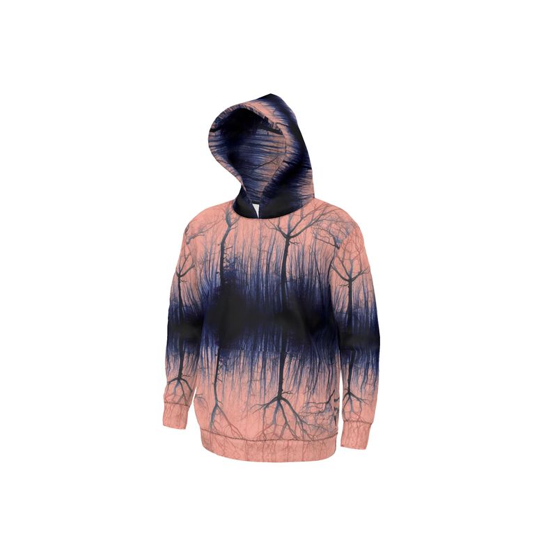 Sunset coral Treflections hoodie. Bring the outside closer to you with this cool woodland inspired design. Wear art. Wear Nature. Feel good.