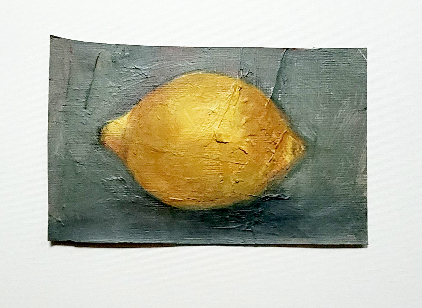 Small original oil study of a Lemon on a textured ground. Approximately 10.5 x 14cm. Ready to be trimmed, mounted and framed. 202323