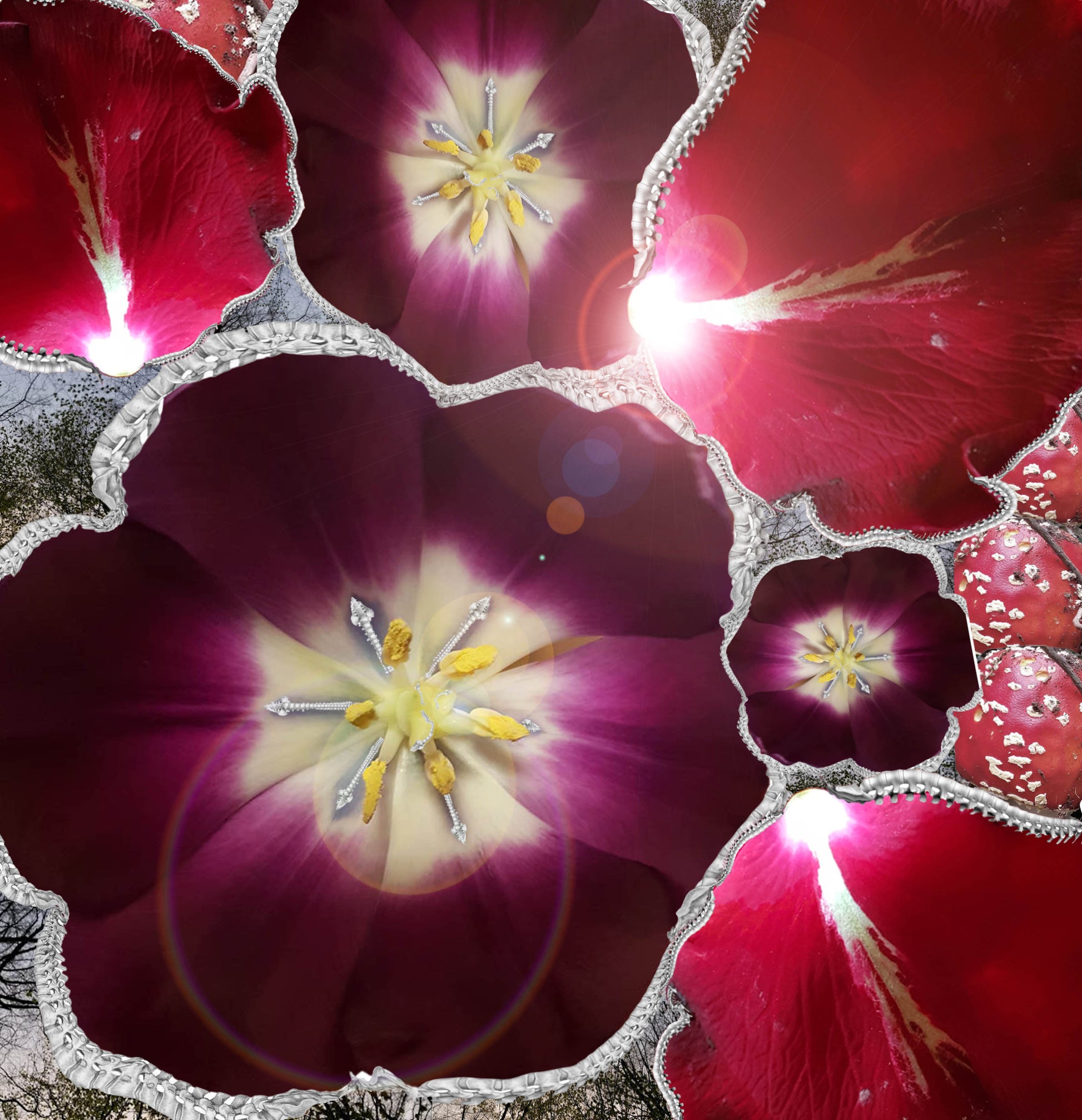 These collages are compiled from manipulated photographs I have taken with my phone and show the things I can’t easily access and have to be fought for through layers of need and new priority. They preference spines, legs and medication, symbolised by toadstools with yew trees representing mortality; all veiling and constraining, with a degree of humour, the nature I am desperate to connect with.